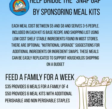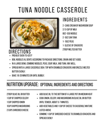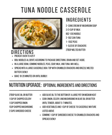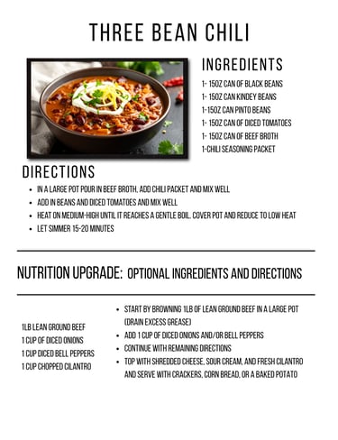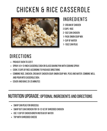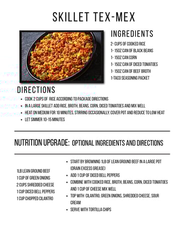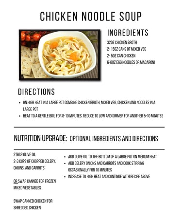 Five recipes based off shelf-stable items with options for nutritional upgrades when items are available. Each base recipe costs between $6-$8 and can feed 3-4 people. All the recipes are designed to be quick and budget friendly.