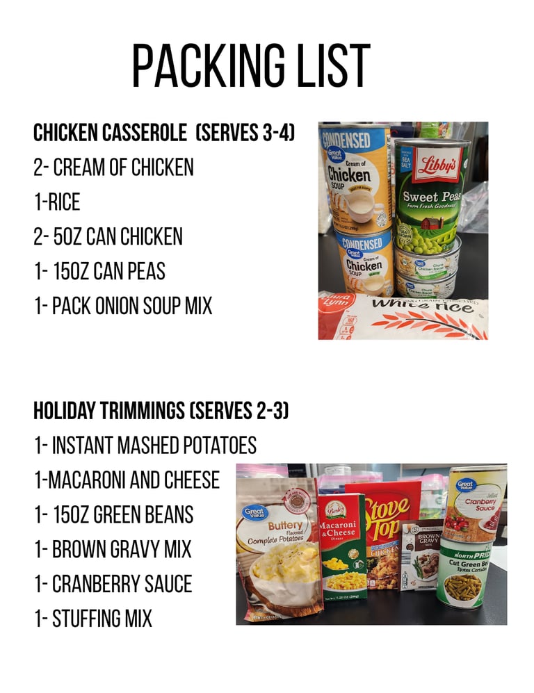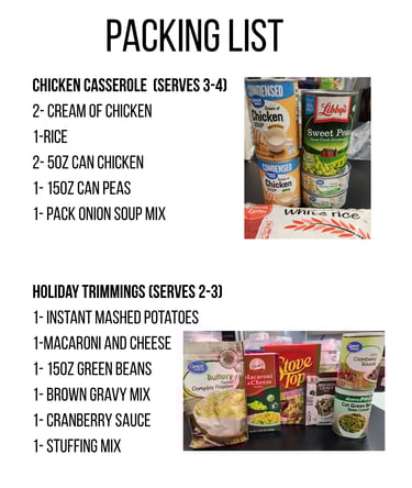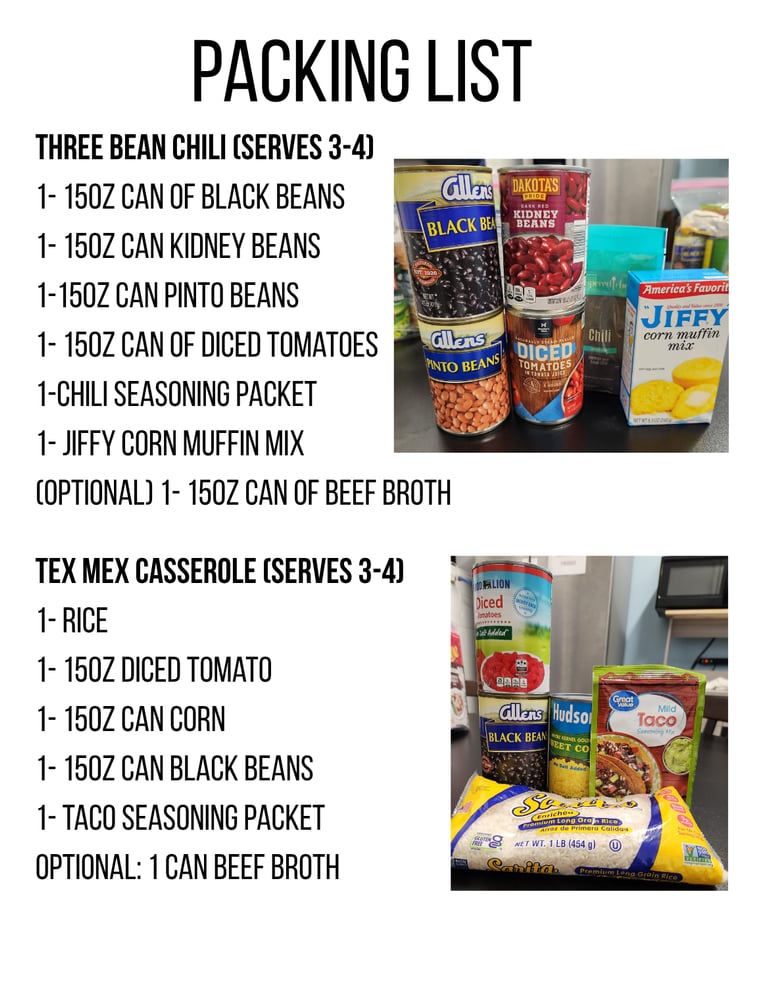 Each meal kit consists a recipe using primarily shelf stable ingredients. Packing lists for each recipe are provided to make it easy to shop and pack. Pick one, two, or all 6 meal kits to collect and build.
